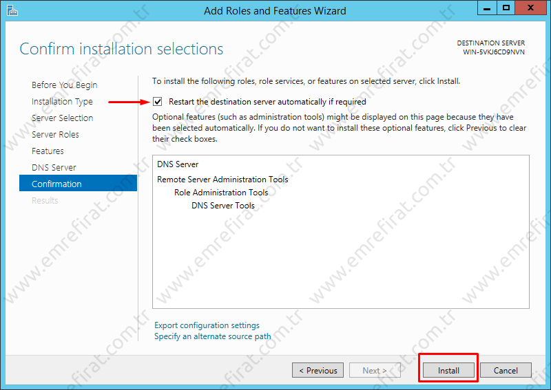 Bu sayfada kuracağımız Roles ve Features (roller ve özellikleri)’ları belirtiyor. Üst kısımda bulunan “Restart the destination server automatically if required” seçeneği “Gerekirse sunucuyu yeniden başlat” anlamına geliyor. Eğer bu seçeneği işaretlersek kurmuş olduğumuz rol veya özellik aktif olması için yeniden başlatmak gerekiyorsa sistem kendini otomatik yeniden başlatacaktır. İşaretlemek veya işaretlememek sizin tercihinizdir. Kurmuş olduğumuz Rolü veya özelliği kullanabilmemiz için yeniden başlatma gerekirse işaretlemediğinizde elle yeniden başlatmanız gerekir.