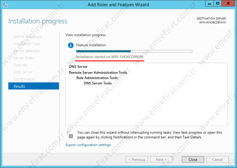 Son iki resimde görüldüğü gibi kurulum başladı ve başarıyla tamalandı. Close tıklayıp Add Roles and Features Wizard (Roller ve Özellikler Kurulum Sihirbazı)’nı kapatabiliriz.