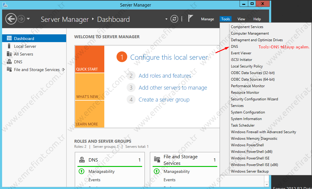 “Server Manager(Sunucu Yöneticisi)”ni tekrar açalım. Sağ üst kısımdan resimde de görüldüğü gibi Tools>DNS adımlarını takip edelim. DNS Manager’i açalım.