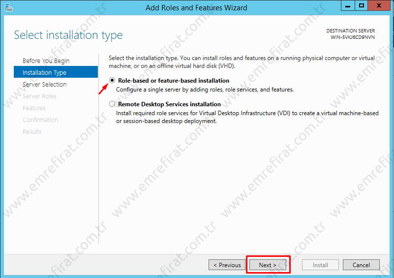 Gelen sayfada “Role-based or feature-based installation” seçeneğini seçip devam edelim.