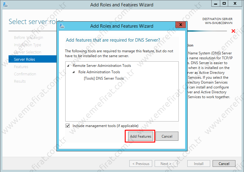 “Add Features” butonuna tıkladıktan sonra “DNS Server” seçeneğinin işaretlenmiş olduğunu görüyoruz.