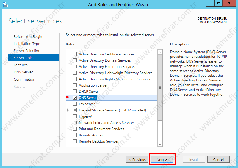 Kurmak istediğimiz sunucu rolünü işaretlememiz isteniyor. DNS Server rolünü kuracağız. Ok işareti ile gösterilen DNS Server’in yanında bulunan kutucuğu işaretleyelim.